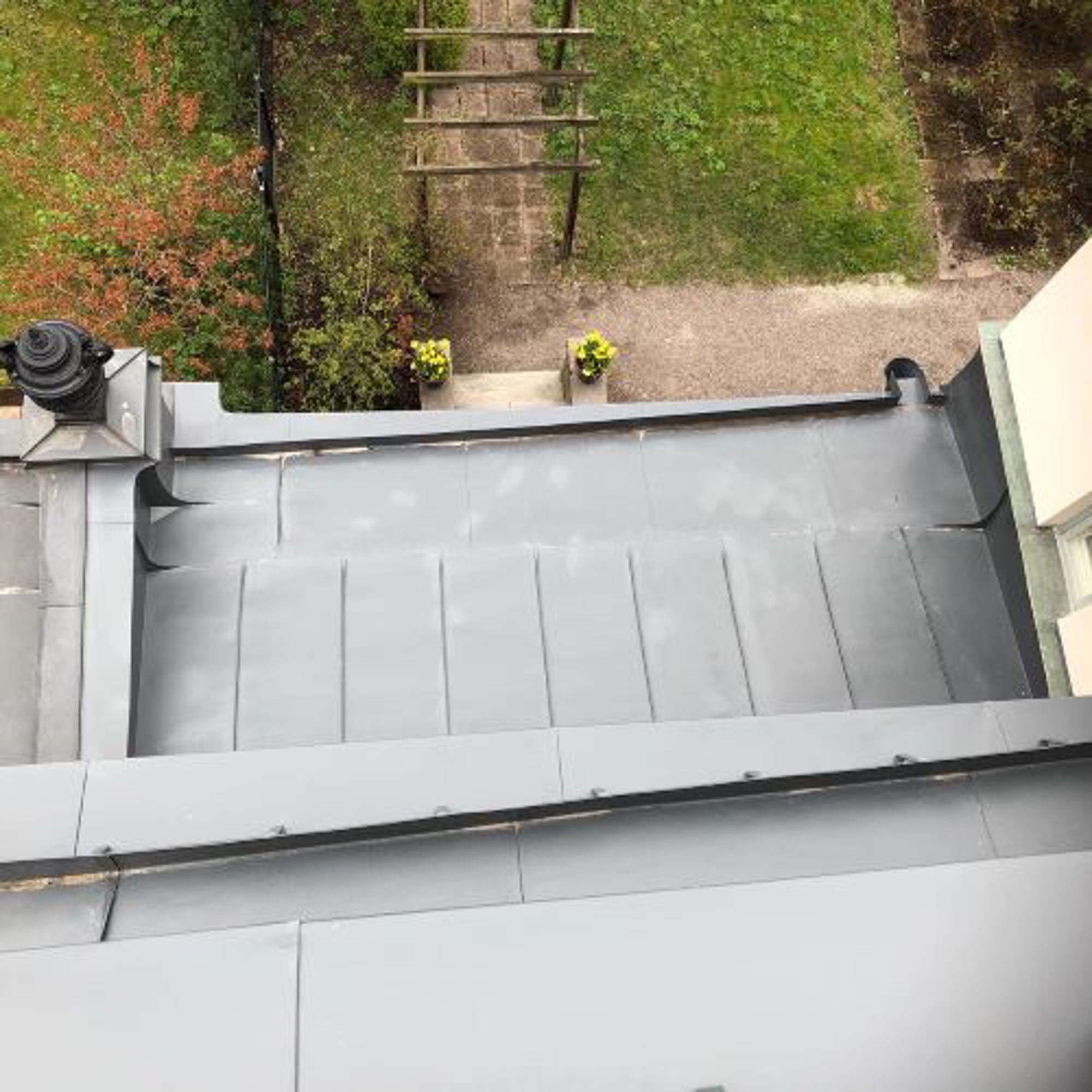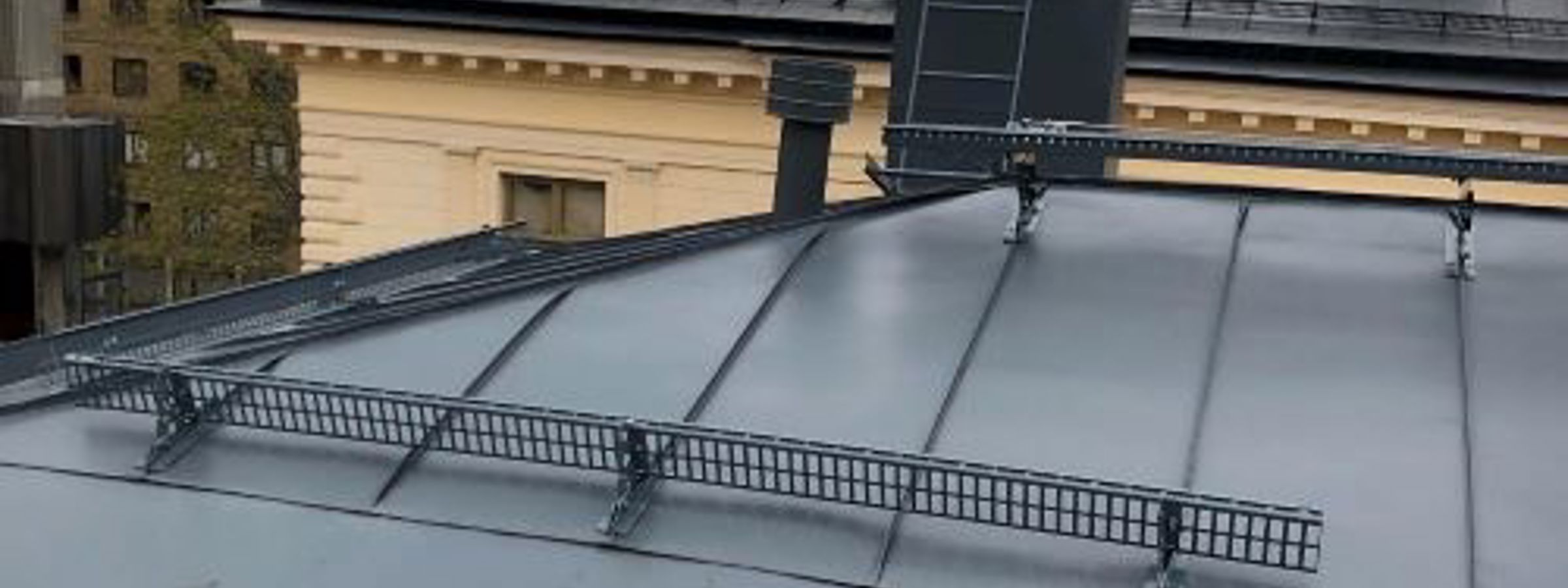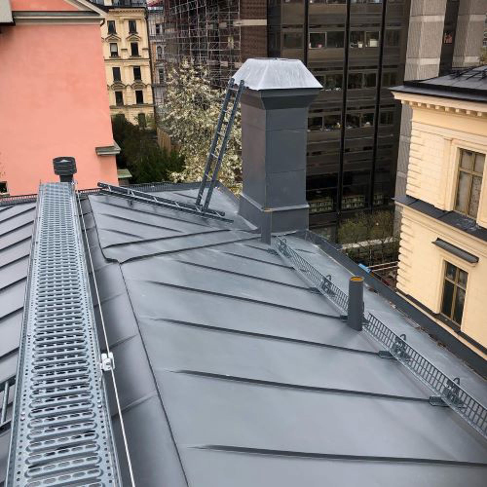Under våren 2020 har vi på Villagatan 14 bytt taket till dubbelfalsad bandtäckning i kulör Plannja PL20